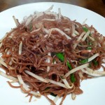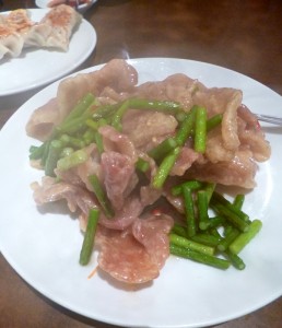 黒板に出ていた 「揚げ豚肉と大蒜の芽の四川風炒め ¥980」 カリッとした揚げ豚が、辛めに炒めてあって、ハオチー!美味しいです。
