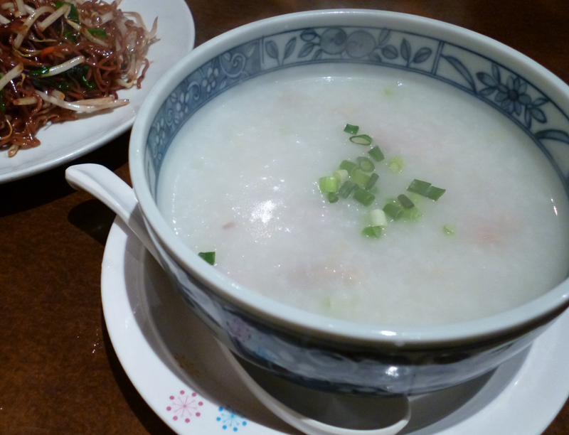 「香港やきそばとお粥のセット ¥1000」 やきそばは細めの麺の薄しょうゆ味で、もやしがしゃきしゃきで、いけてます。 鶏肉お粥もアツアツで、普通に美味しい。