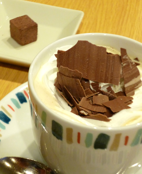 動物の骨格やはく製を見ながら、チョコレート展記念デザート 「ホットウィンナーコーヒー ¥400」 と スイスジュネーブ ステットラー社 の 「パヴェ・ド・ジュネーブ 1個 ¥240」 を、いただきます。 (・・・やはり、食べてばかりか。;;(^Д^);;)