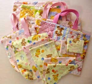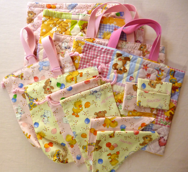 布だけ持ち込み、ベルト・紐・マジックテープ・ゴム・裏布等はこちらで用意して、その値段も込みでの料金です。 (写真は2人分。)
