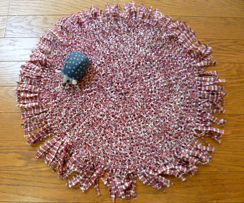 次回の教室(4月26日第4金曜日予定)では、布を切ってマットを作ります。 魚のキッチンマットは2m位、丸いマットは1.5m位で、出来ます。