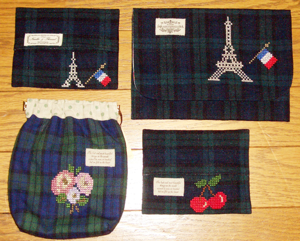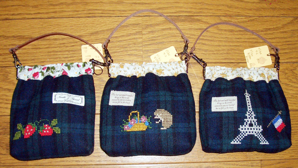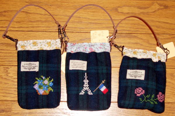 引越してから、なかなか作れなかったまろんちゃんが、納品に来ました。 やさしいモチーフの手刺繍がうれしい、「革ひも付き、デジカメケース ¥1580・¥1680」「革ひも付き、たてながポーチ ¥1344」「ティッシュケース ¥735」「フタ付きポーチ ¥1680」「おおきいポーチ ¥1418」。 いずれも、エッフェルや苺や薔薇などのていねいな刺繍が、こころを和ませてくれる、手作りならではの、力作です。