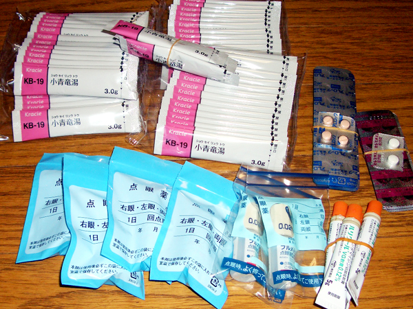 「小青龍蕩」「アレロック」「セレスタミン」「フルメトロン」「パタノール」「ルリクール」をいただき、ひと安心。 これだけあれば、当分上だけ向いて歩く事もなさそうです。 お店では、鼻水をしゅんでいる時も多いと思います。 お見苦しい状況で申し訳ございません。