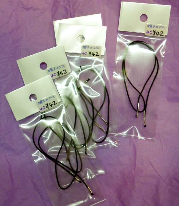 「帽子のゴム ¥42」 見つかりました。 先っぽに金具があるので、簡単に付けられます。