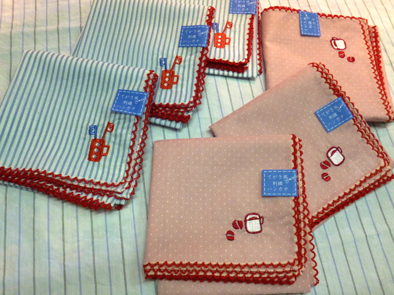 「刺繍ハンカチ ¥525」 手書き風刺繍のワンポイントと廻りのレースがなんとも可愛い感じ。・・・と、どんどん商品入荷中です。 お店に見に来て下さいね。