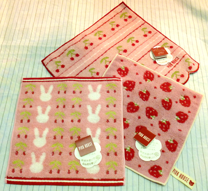 ポケットに入るミニサイズ 「ピンクハウスハンカチ 名前タグ付き ¥368」 「ピンクハウスハンカチ ¥525」 スカラップカットに、ラメ糸のラインが入っています。