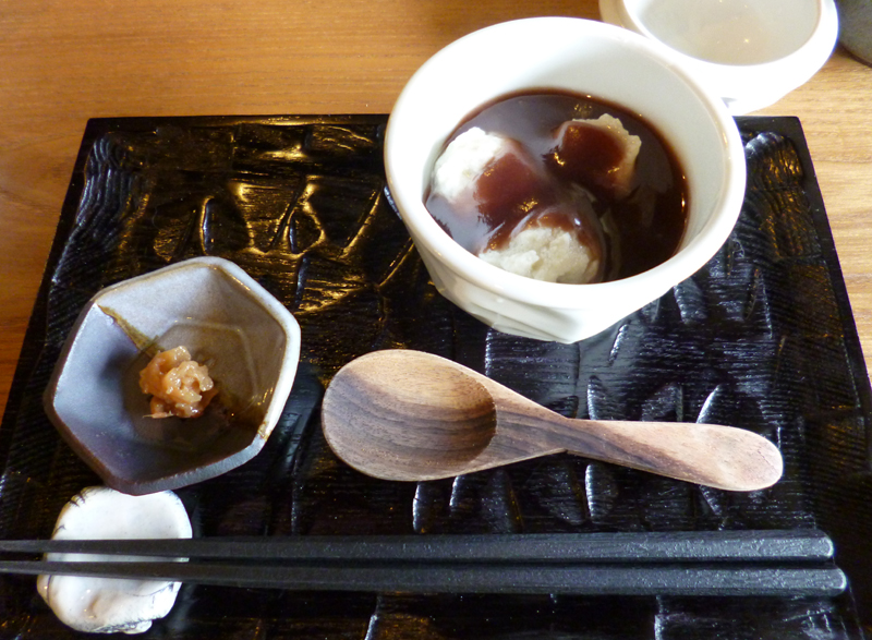 濃い目の美味しい蕎麦湯をいただいてから、「蕎麦ぜんざい 500円」 あつあつのこしあんの中に、蕎麦がき団子3個が、入っています。 梅干しが付いて、あま甘で幸せ。
