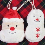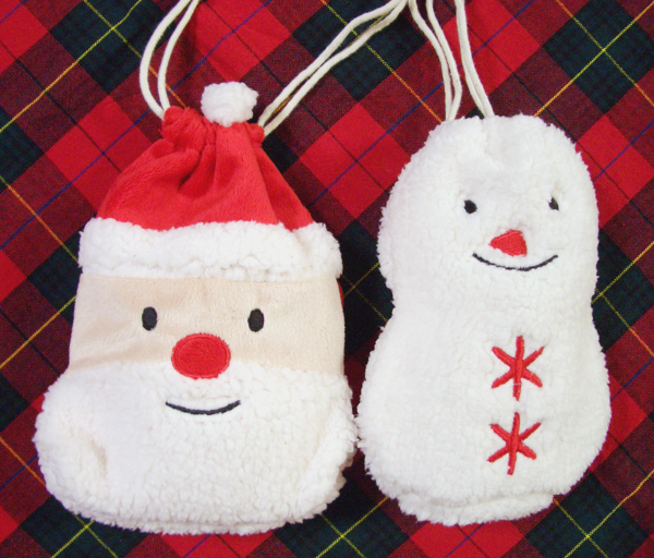 クリスマスのプレゼントを入れる巾着。 サンタとスノーマンの形。 ¥378 もこもこふわふわの触感に、みんな癒されます。