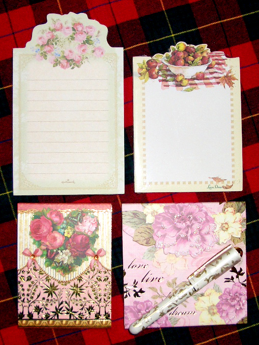 お問合せの多い、大人のメモノート。 いろいろあります。 左上/薔薇柄のメモ ¥368 右上/リンゴ柄のメモ ¥420 左下/マグネット止め付きカバーの、薔薇柄のメモ ¥546 右下/ペン付きの、薔薇柄のメモ ¥682 薔薇柄多いです・・・! (;’□’)!!