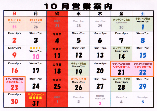 教室: パッチワーク 14日(第2金曜)・28日(第4金曜) テディ・ベア 1日(第1日曜)・19日(第3水曜)
