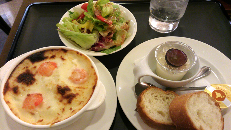 海老のグラタン、サラダ、パン、プチデザート、ドリンクが付いています。 炭水化物多めですが、隣に座っていた奥さまは、サクッと完食されていました。 私はパン1個とご飯を少し残してしまいました。