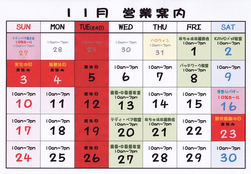 「テディ・ベア教室」 11月20日(水) 10:00AM~12:00PM
