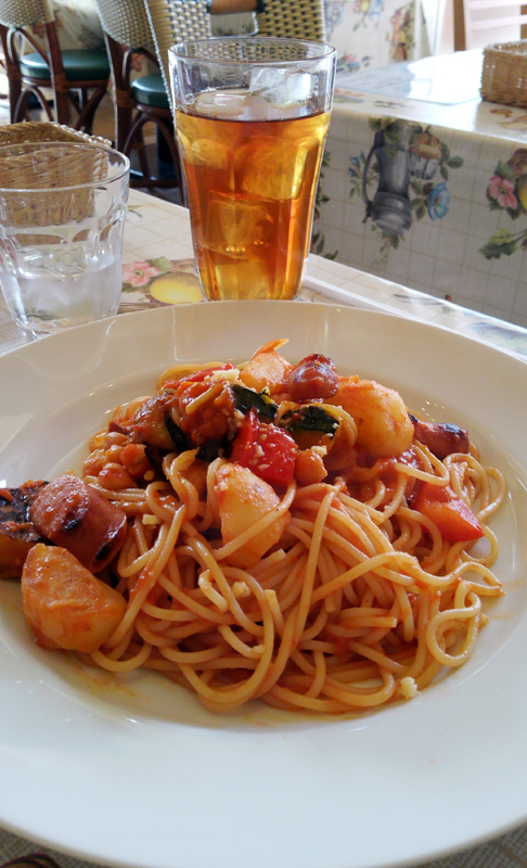 「サラダ」と「アイスティー」と「粗挽きソーセージとシチリア野菜とビーンズのポモドーロ」 を、選択。