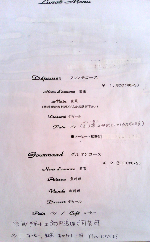 「フレンチコース 前菜・主菜・デセール・パン・紅茶 ¥1700」 をお願いします。