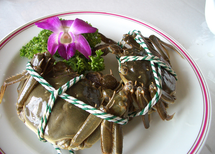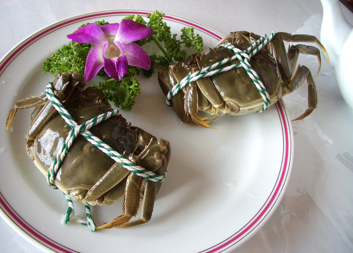 今の時期の蟹はオスが、良いそうで、11月はオス・メス良いそうで、12月はメスが良いらしいです。 陽澄湖から送られてくる最上の上海蟹は、きれいな水にいるため身が白くて美味しいそうです。 きたない水にいるのは駄目です。 と、サーブのおじさんが力説!!