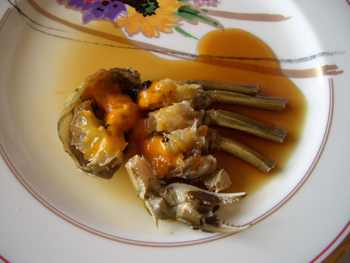 老酒につけた「酔蟹」。 最近、生の蟹、蝦を食べると、喉がとてもかゆくなってしまうので、あまり食べれません。 半分で我慢。 とろりとしたみそがたまりません。 酔っ払ってしまいそうになるほどで、ソースも全部スプーンですくっていただきました。 うまうま。
