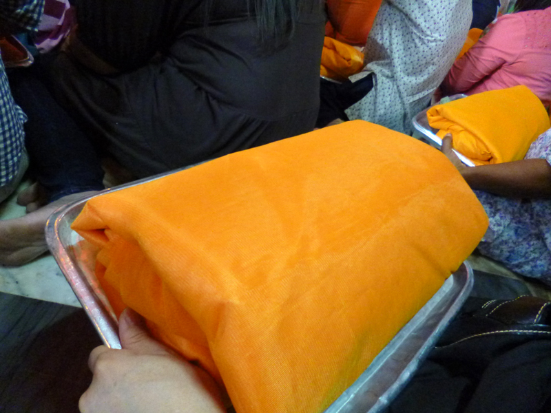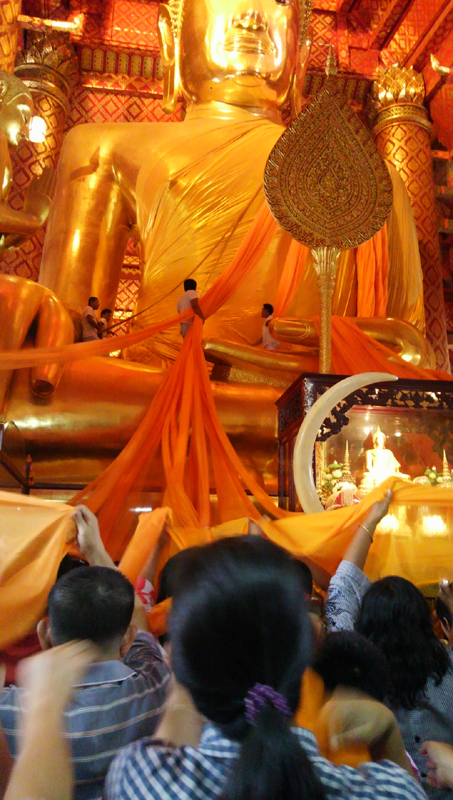 黄色い布は、ひとつづつ、係の人に上に投げあげられ、上にいる人が仏様にかけてくれます。