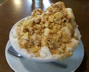 ナッツとグラノーラとバナナのこま切れが乗って、ミルクキャラメルがたっぷりかかっています。