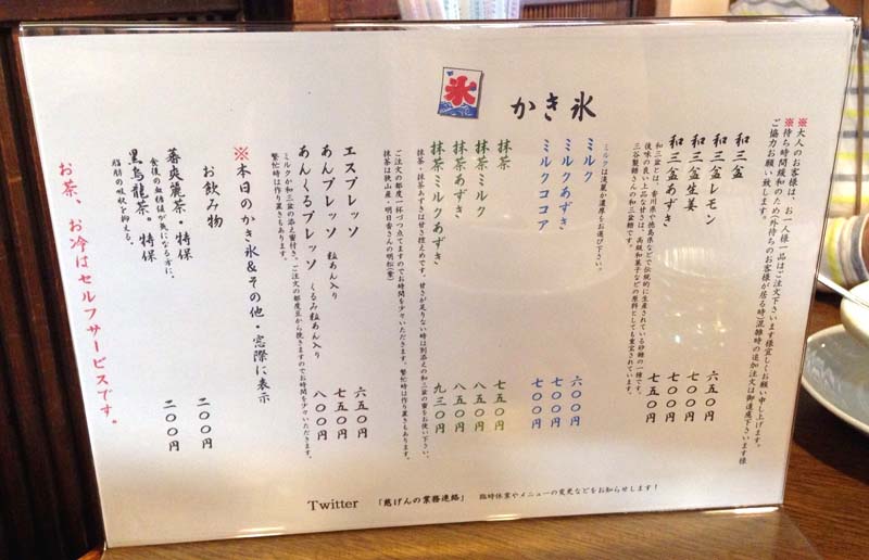 ガラガラと扉を開けて入ると、いきなり、「かき氷、だけですよ。」 と、言われました。 冬はおうどんもある様です。