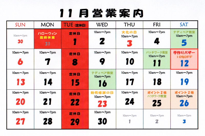 営業案内のカレンダーが、11月の予定ですので、よろしくお願いします。