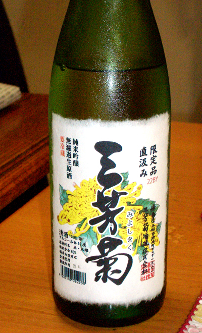 休み前なので、日本酒をひとくち。 丸文で買った徳島の酒 「三芳菊」 はじめて呑みましたが、甘くてほのかに菊の香りが。 9月9日の重陽の節句に呑むと、長生きしそうでいいな~。