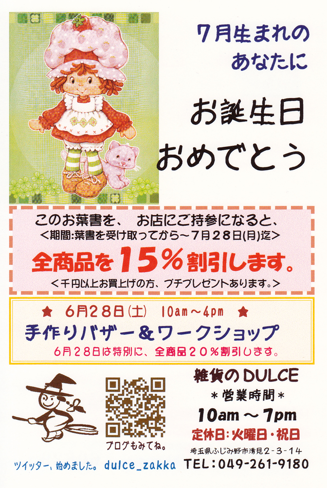 7月生まれで、お葉書の届かなかったお客様は、お店でお誕生日の登録をして下さい。 その場で割引き致します。(7月28日迄)