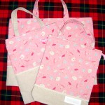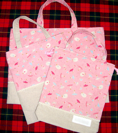ピンクでバレーの柄、切り替えとレースが付いています。 「シューズ入れ ¥1470」 「トートバック ¥1365」 「レッスンバック ¥1890」