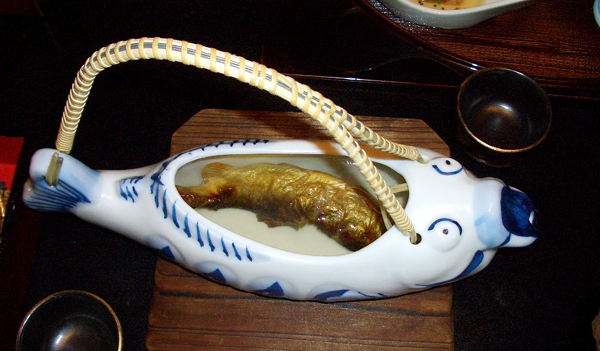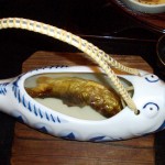 お料理は、器も小さくてかわいらしく盛り付けしてあり、食べやすかったです。 追加で頼んだ、岩魚の骨酒は、お茶目な魚の形の陶器に入っていて、楽しい感じ。
