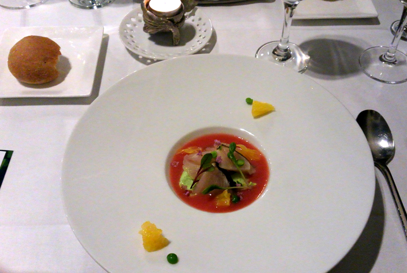 「グリーンピースのムースと鰆の炙り フルーツトマトのソースに八朔添え」