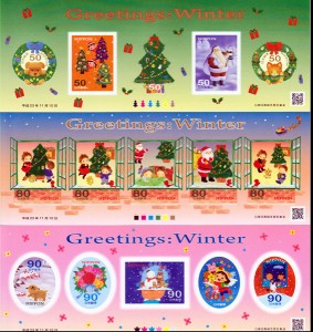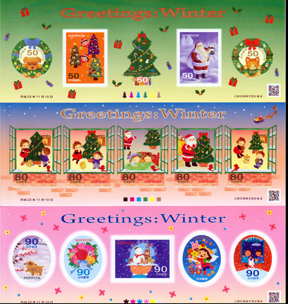 「50円切手 5枚シート ¥250」、「80円切手 5枚シート ¥400」、「90円切手 5枚シート ¥450」、の3種類。
