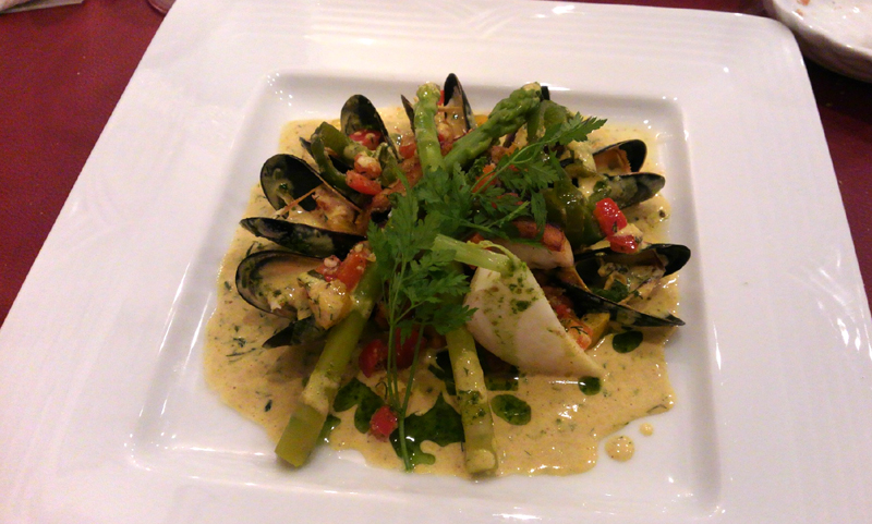 主菜、私は「鮮魚のポワレ モンサンミュシェル産ムール貝のカレースープ仕立て」