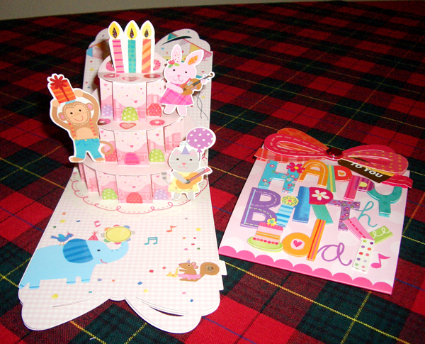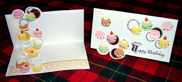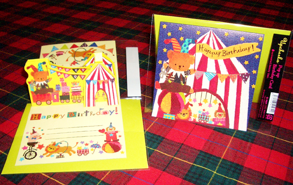 「ピンクのバースディボックス¥399」 ケーキがポップアップして、動物たちのにぎやかなカードです。 「くまのサーカス小屋 ¥336」 くまのサーカス小屋がポップアップして、可愛いカードです。 「マカロン ¥399」 マカロンが飛んでいる、優しくて美味しそうなカードです。 他にもたくさん素敵なバースディカードを発売中です。 お買得もありますので、よく見てさがして下さいね。 カードを貰うと、とても嬉しいと思います。