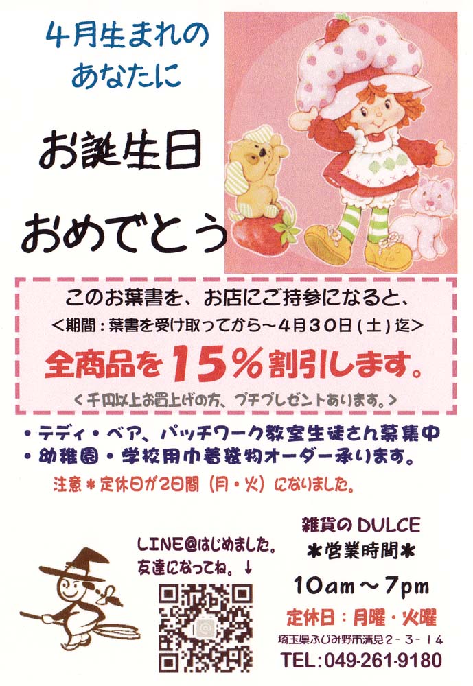 ★ 4月生まれで、お葉書の届かなかったお客様は、お店でお誕生日の登録をして下さい。 その場で割引き致します。(4月30日迄)