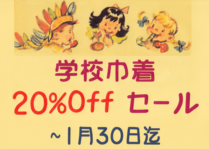 今月、1月30日(月)まで、手作り学校巾着が、20%オフセールで、お買い得です。