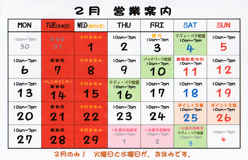テディ・ベア教室 2月4日(土)・16日(木)15日がお休みなので、変更。