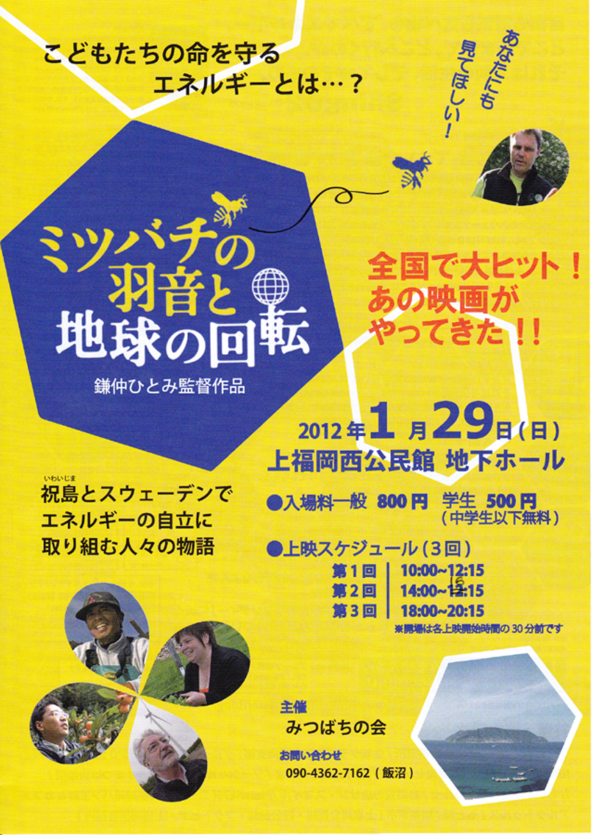 本日(1月29日 日曜日) 「ミツバチの羽音と地球の回転」の自主上映会が、西公民館で、あります。 朝10時、昼2時、夜6時の、3回ですので是非行ってみましょう。 中学生以下は無料です。 当日券もあります。