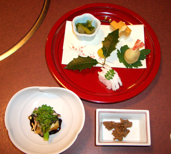 先付けと、前菜。 ビールと日本酒で、幸せモード全開。