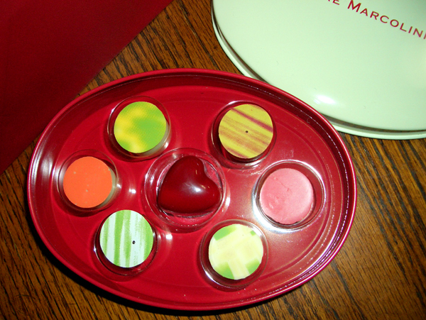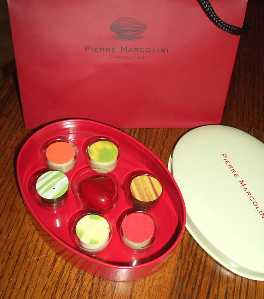 前から食べてみたかった、「ピエール・マルコリーニの、パステルセレクション」 フルーツを使ったキャラメルソースを、クーベルチュールに包んだプラリーヌ。 おすそわけが、うまうまでした。