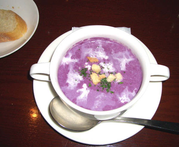 スープは、「紫芋の温製スープ」。 きれいな紫色でトロリとしています。 体が温まり、ほんのり芋の甘みが。