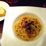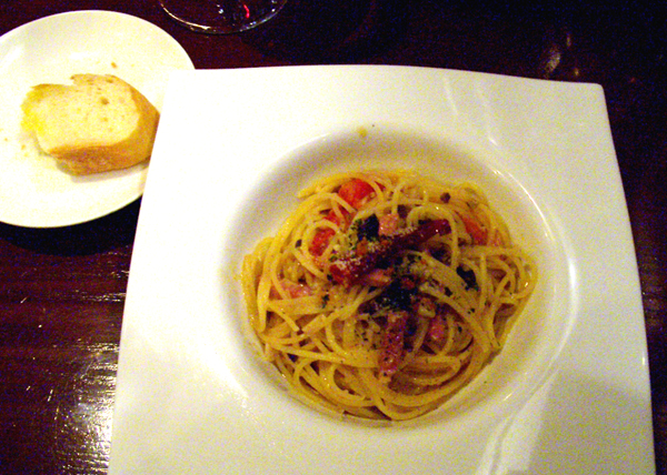 「ベーコンとブッタベーストのペペロンチーノ」 少なめで、食べやすい量のパスタ。 暖かいうちに、いただけます。 うまうま。