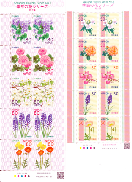3月1日発売切手、「季節の花シリーズ 第2集」 ¥800(¥80×10枚) と ¥500(¥50x10枚)