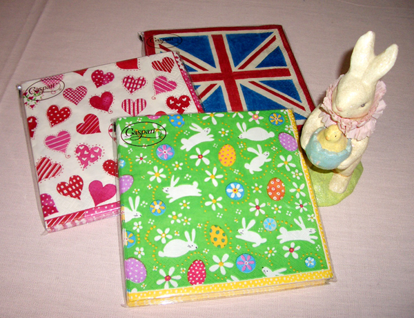 デザインがかわいい、ドイツ製の紙ナプキン。 10枚入り 33×33cm 3枚重ね ¥388(370)。 きれいな若草色で、卵とうさぎ柄は、イースターサンデーが近いから?