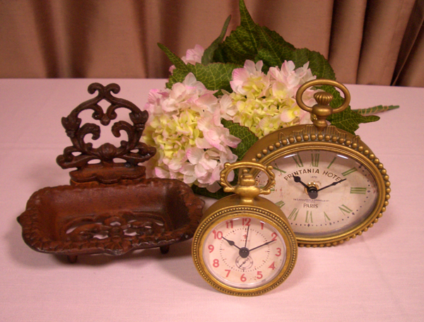 「ソープトレイ ¥1500(1429)」 アイアンの色合いがアンティーク風 ガーデン水回りのポイントになります。 「掛け時計 楕円型 ¥3990(3800) 丸型 ¥2835(2700)」 小さめなアンティーク風掛け時計。 裏は見えませんが、可愛いです。 「あじさい 1本 ¥399(380)」 薄いピンクで、写真は3本、束ねてあります。