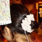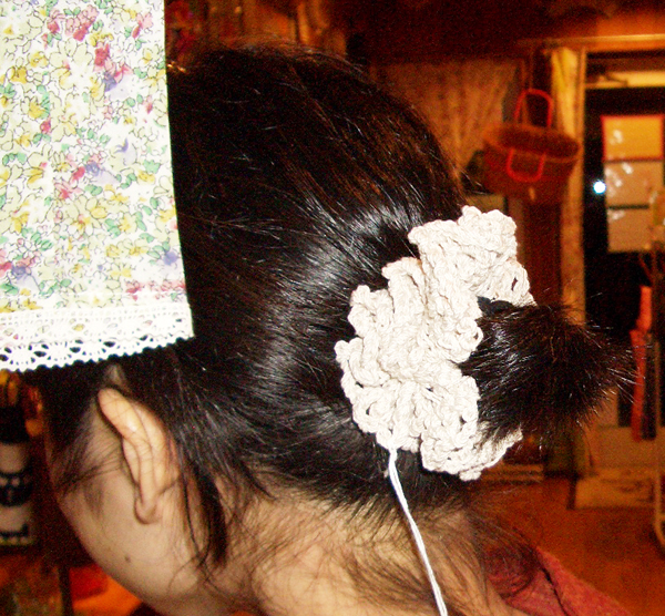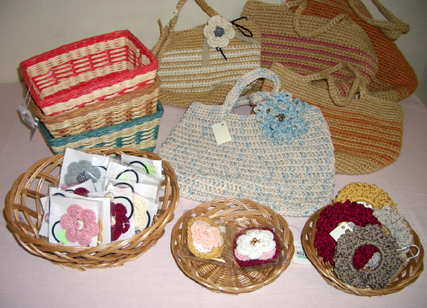 お待たせしました。 nacyu hanaさん、大人気の花ゴムを、たくさん編んでくれました。 「花ゴム ¥315(300)」 「シュシュ ¥315(300)」 「パッチン ¥525(500)」 「麻バック SALE¥1575(1500)~いろいろ」 真ん中手前の、大き目のパッチン止めは、新しい形のチャレンジで、可愛いですね。 麻のバックは、お得なSALE品もあります。 昨日はさっそくファンの方が、数点お買い求めに。 卒園式に間に合わなくて、ごめんなさい。 シュシュも付けると、とても素敵になります。