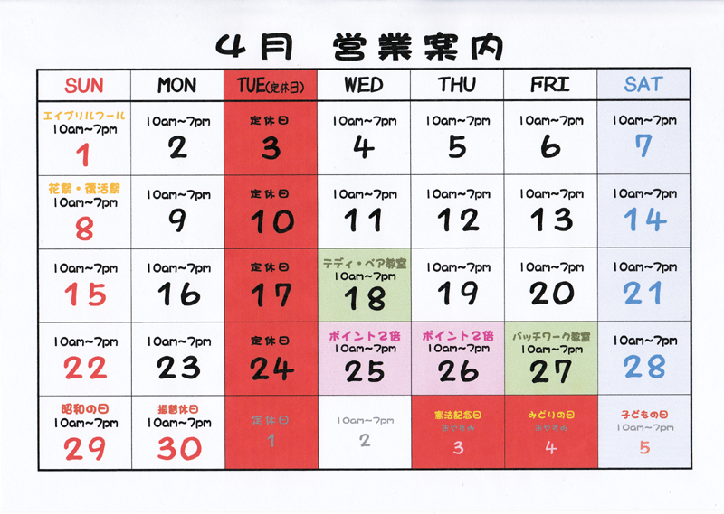 4月の営業案内