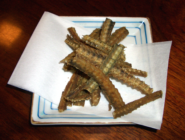 風の嵐だった、火曜日。 食料品が底をつき、うどんでも食べようと、出掛けた甚五郎は、臨時休業! がーーん。 で、久しぶりに 「ぽんぽこ亭」で、鰻を食べました。 お酒のあては 骨センベイ、これ大好きでボリボリ食べます。 好物の筍のお刺身。 今年は放射能も恐いので、娘にはあげないで、年寄りの私が、いただきます。