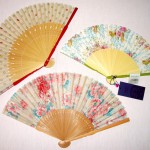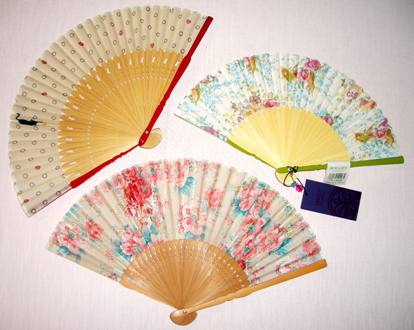卸の展示に出始めの、今年の扇子を、買ってきました。(¥2100~) 綺麗なお花と、猫とマリの柄の、お薦め3本です。