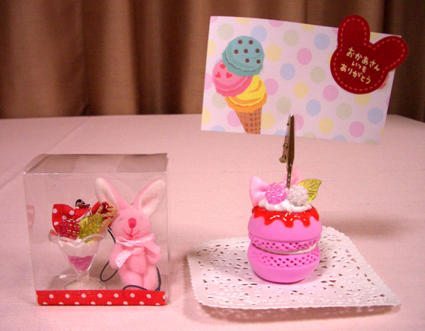 マカロンさんの、母の日のプレゼントに出来る、「カード付きメモスタンド 材料費込¥500」と、「うさぎ付きパフェ 材料費込¥500」。