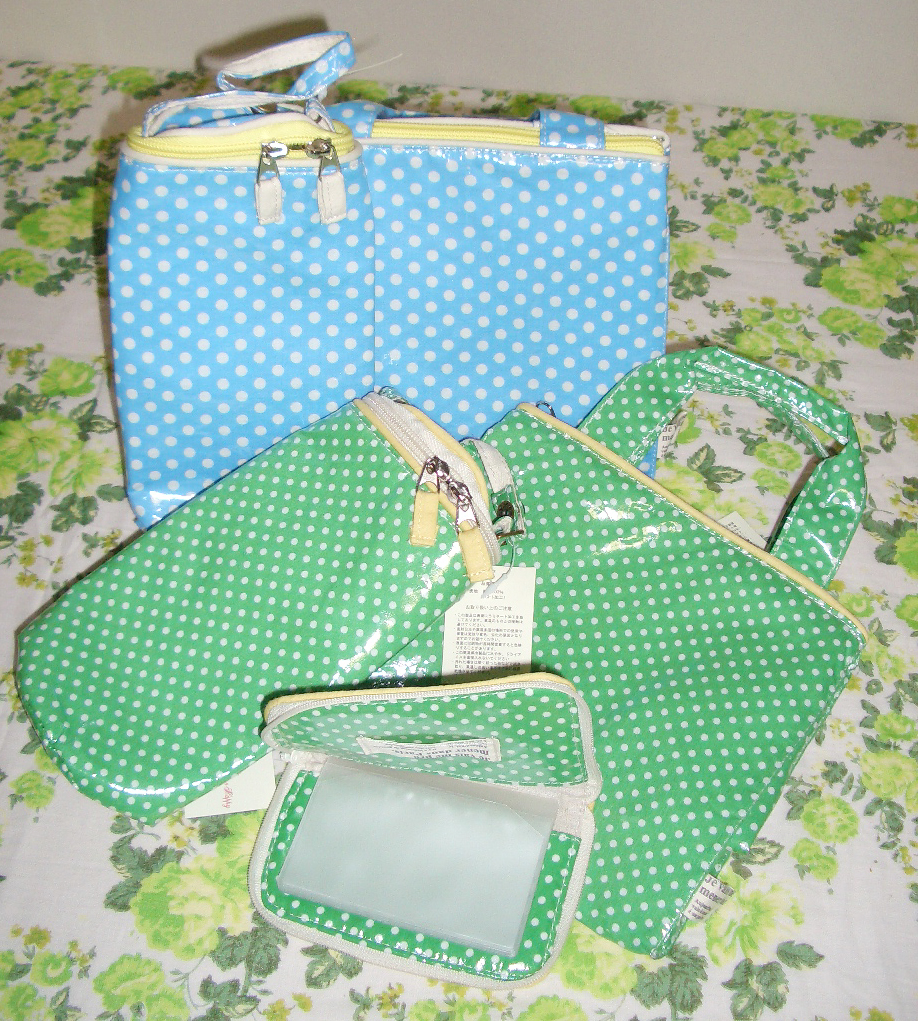 こちらは仕入品の水玉シリーズ。 「ランチバック ¥1365」 「ボトルキーパー ¥1260」 「カードケース ¥1050」 ラミネートされていて水にも強く、暑い日の必需品です。