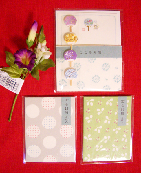 かわいい 「ポチ袋 4枚入り ¥189」 見つけちゃいました。 繊維が強く、独特の風合いを持った、愛媛県産の伊予和紙を使用。 表面が強く書き易い伊予和紙の、ミニレターパット 「こころぶみ箋 ¥378」 は、団扇の立体シール付きです。 「朝顔 ¥210」 も、小さな瓶に飾れます。